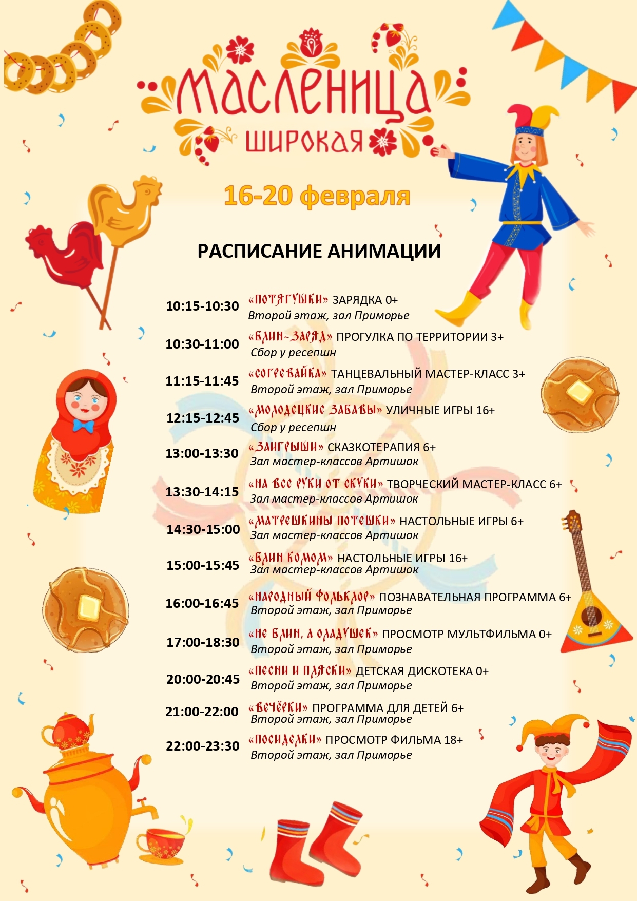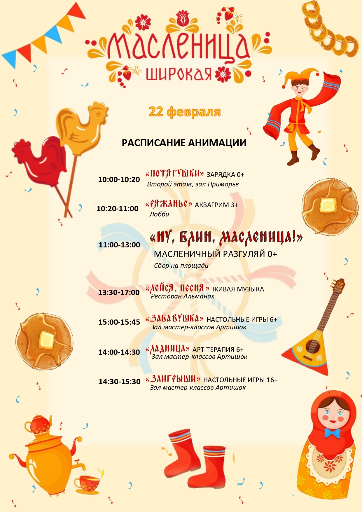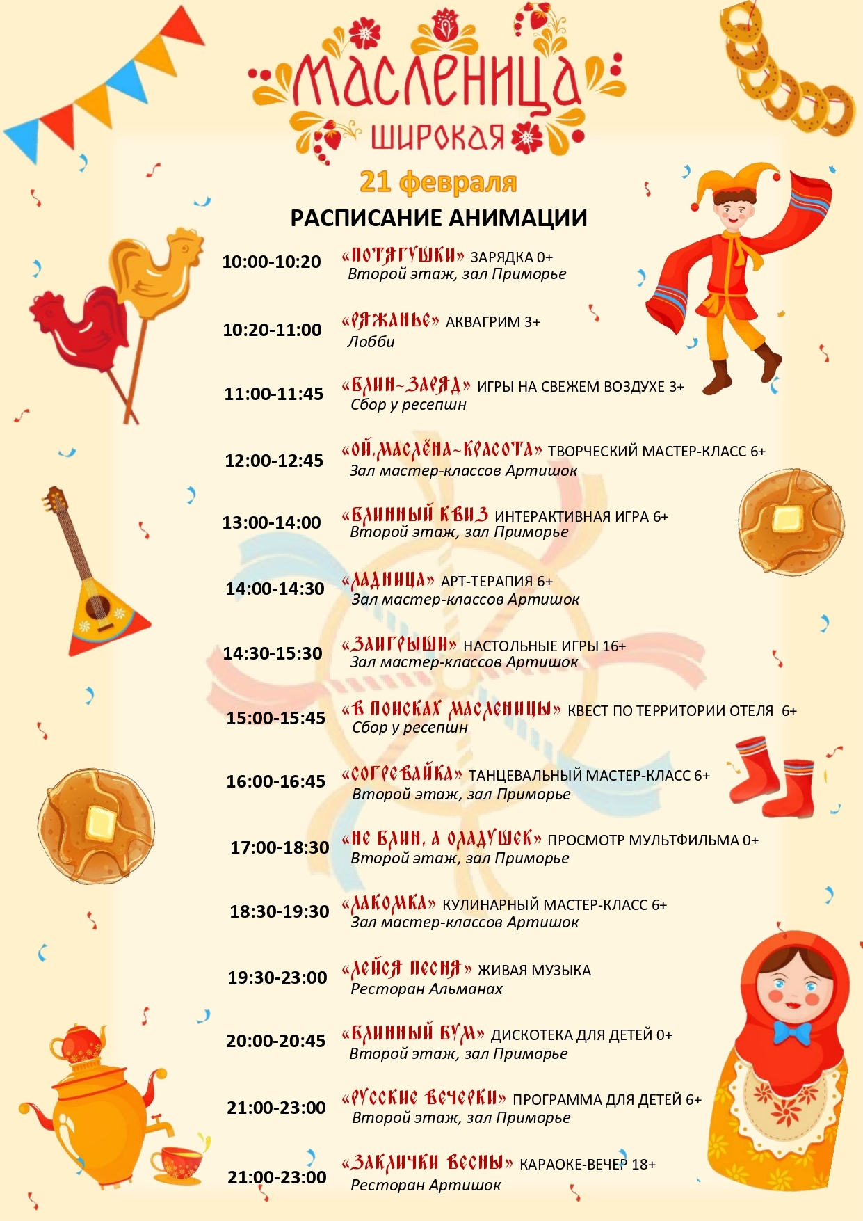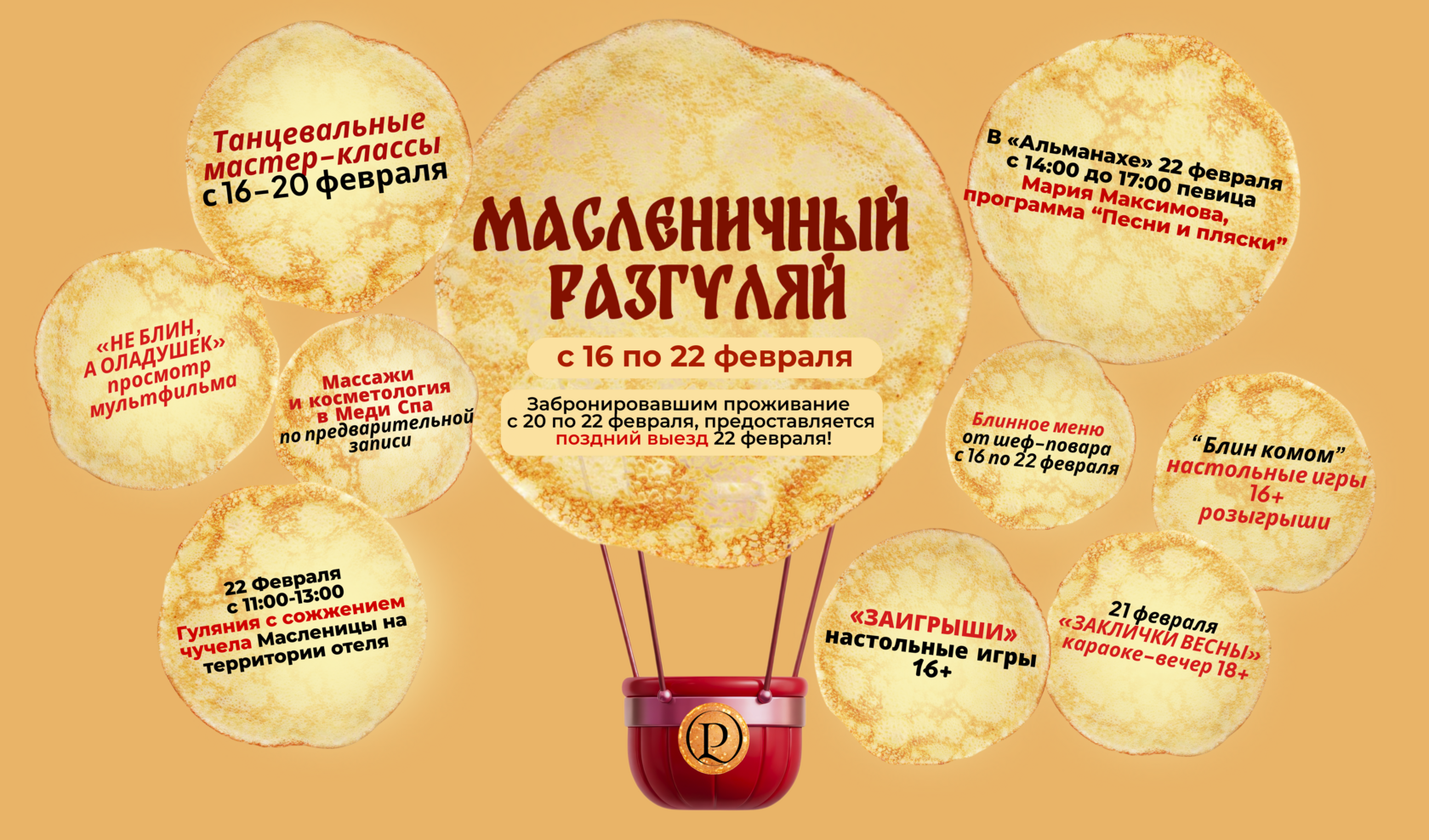 Гуляния с сожжением чучела Масленицы на территории отеля, в ресторане «Альманах» :певица Мария Максимова c программой «Песни и пляски», блинное меню от шеф‑повара и многое другое. Ждём вас!