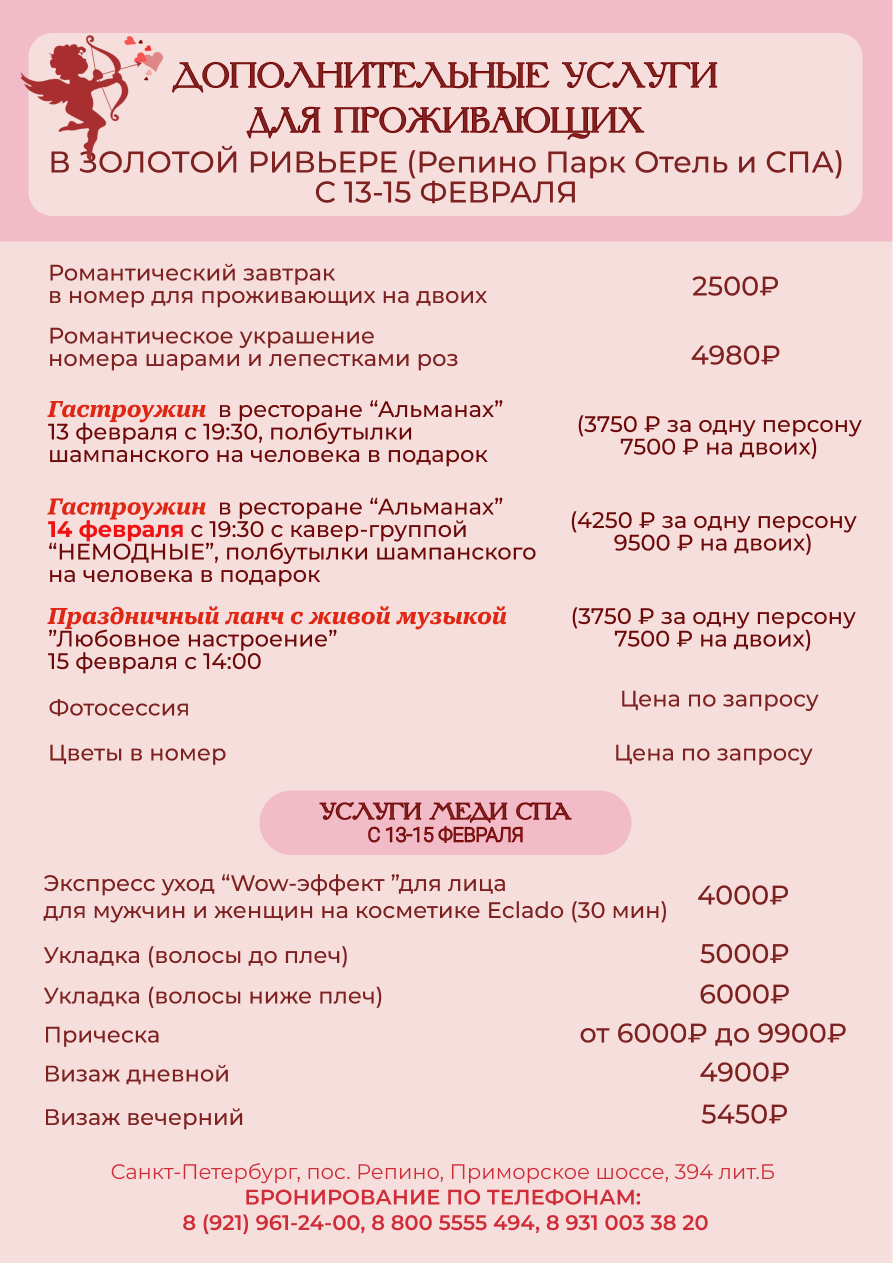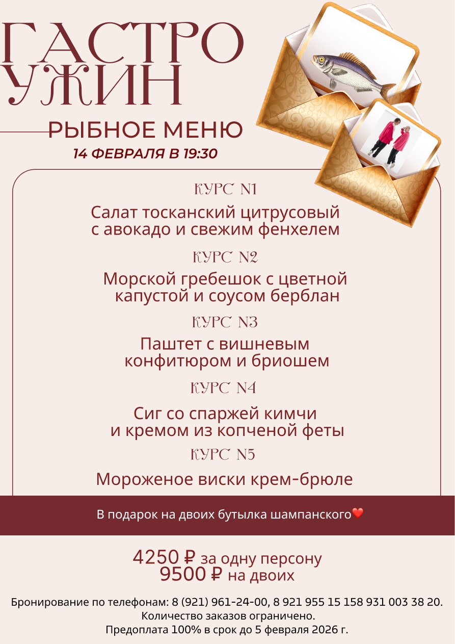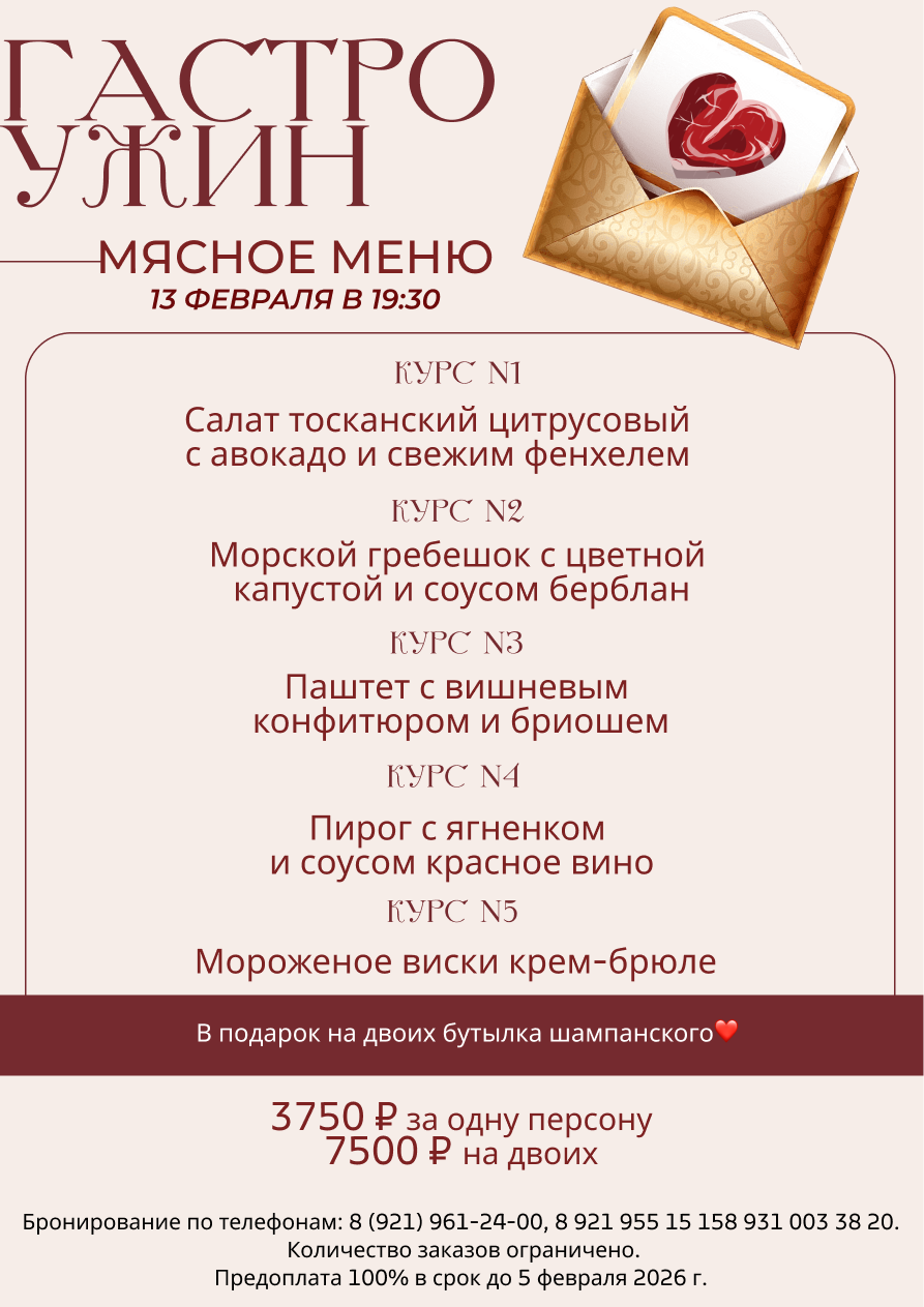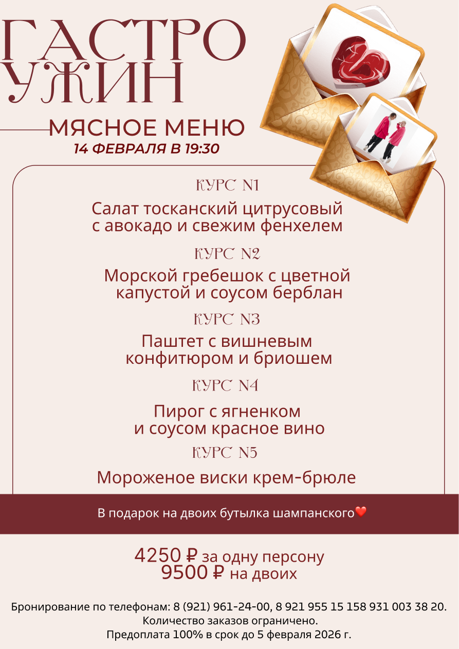 -15 февраля с 14.00 Праздничный ланч (3750 ₽ за одну персону, 7500 ₽ на двоих). Количество заказов ограничено, предоплата 100% в срок до 5 февраля 2026 г. Для бронирования ужина требуется 100% предоплата. Бесплатная отмена ланча возможна до 5 февраля. С 6 февраля бесплатная отмена невозможна, взимается 100% штраф.