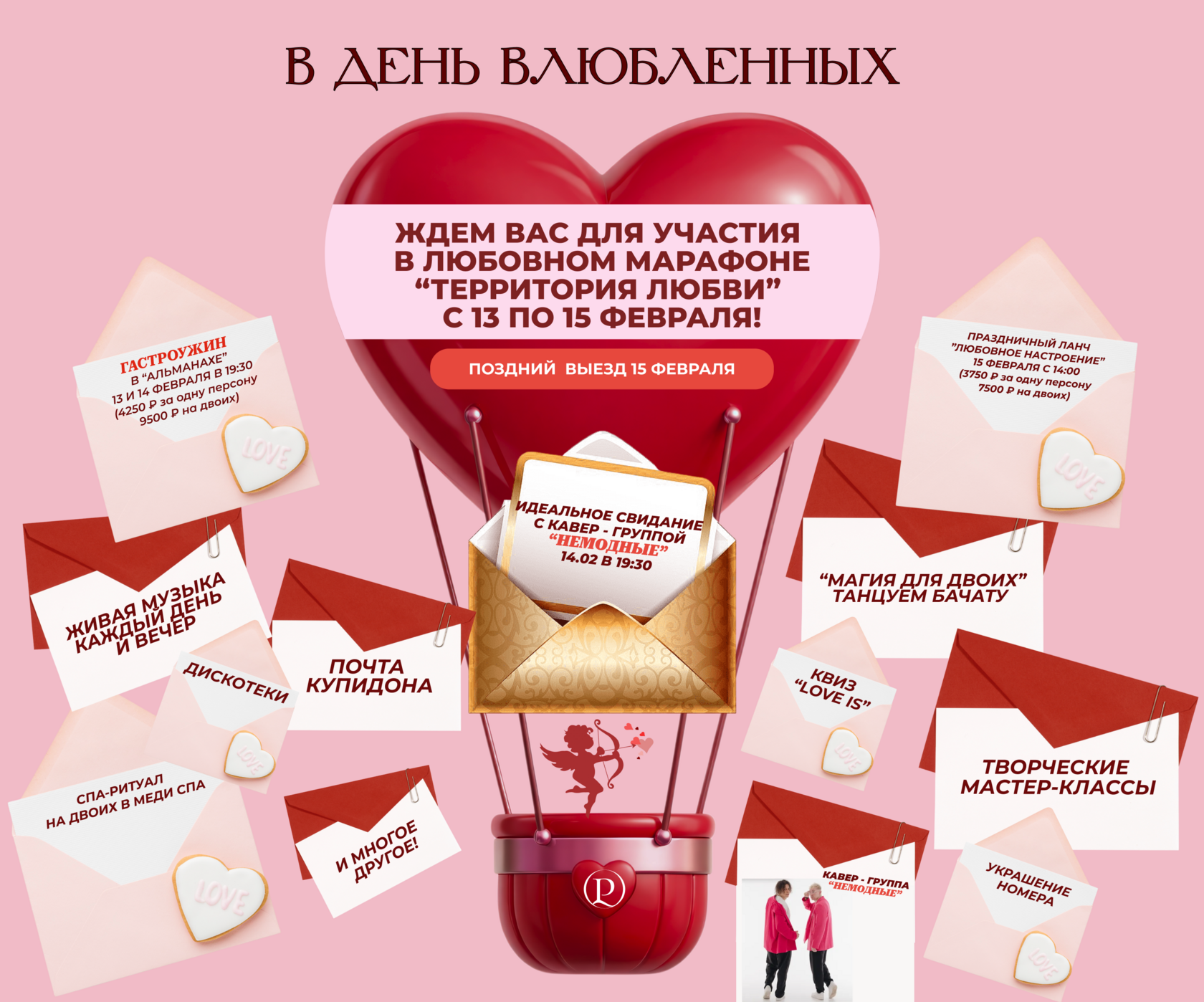 · 14 февраля — восторг и интерактив с кавер-группой «НЕМОДНЫЕ» в сочетании с гастрономическими изысками от нашего шеф-повара.