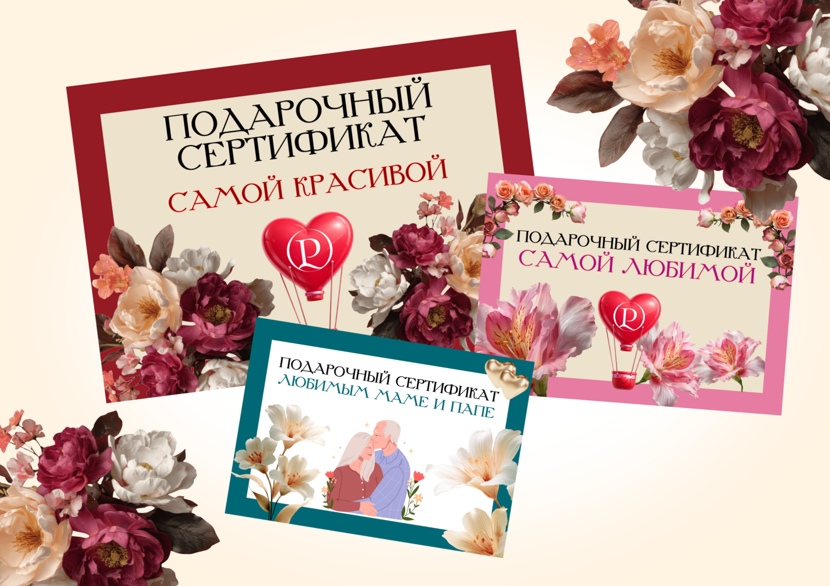 Подарочные сертификаты номиналом: 10 000, 15 000, 25 000, 35 000, 50 000 и 100 000 рублей.